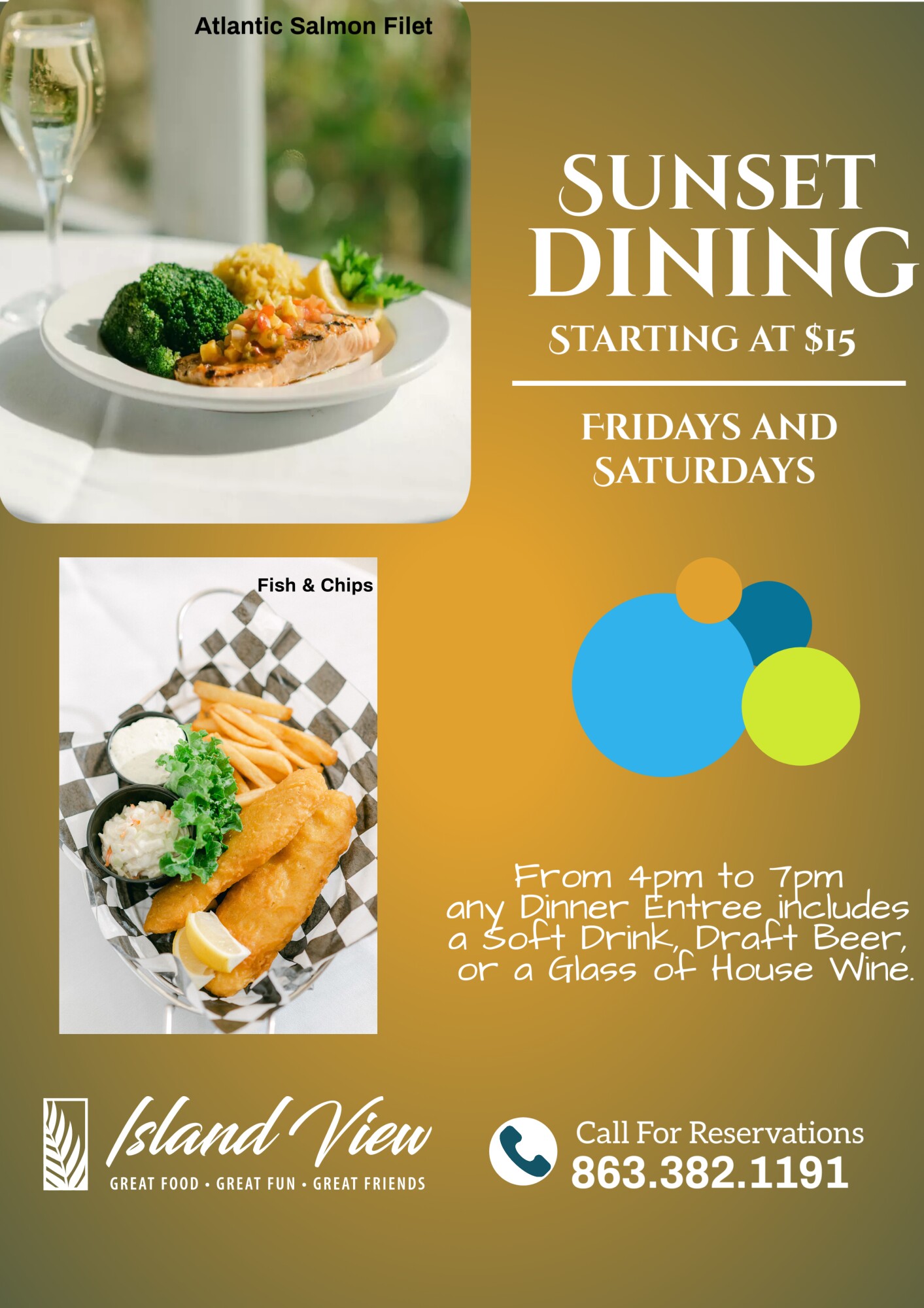 September 27, 2025 @ 4:00 pm - 7:00 pm Sunset Dining: Friday & Saturday Night
